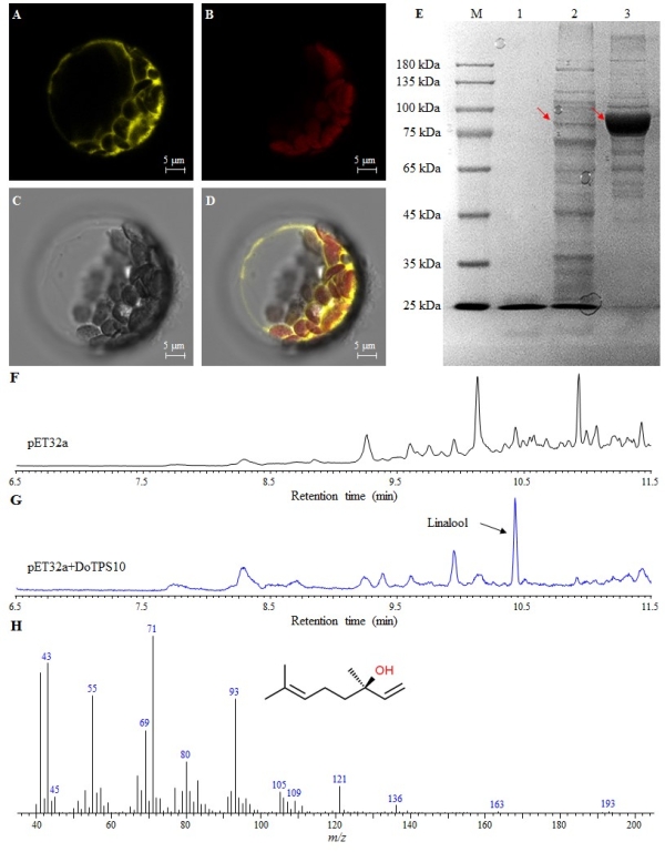 图2.铁皮石斛萜类合酶DoTPS10的亚细胞定位及其体外功能分析