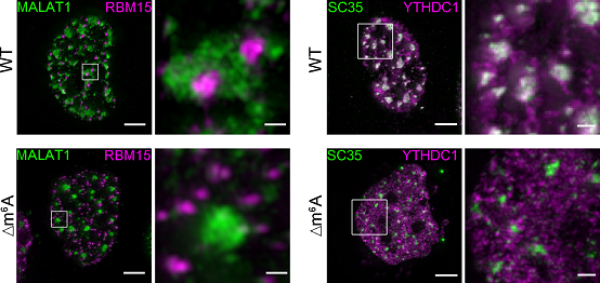 图1.野生型和MALAT1-Δm6A细胞中RBM15斑点与核斑互作,以及YHDC1在核斑中富集程度的对比