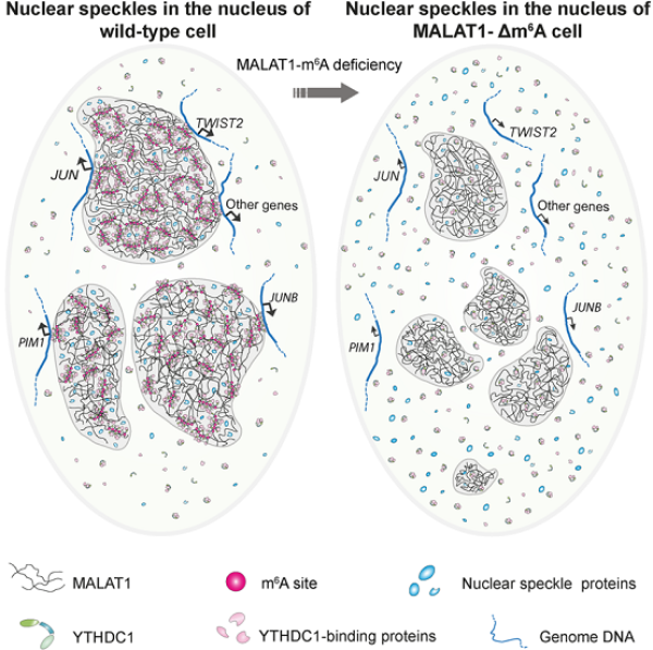 图2.MALAT1通过其m6A修饰调控基因表达示意图