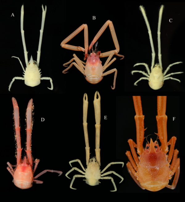 近日,Zoological Journal of the Linnean Society(《林奈学会动物学杂志》)在线发表了中国科学院海洋研究所海洋生物分类与系统演化的最新研究成果。科研人员采用形态分类学与分子系统学方法,对采自西太平洋雅浦海沟和马里亚纳海沟附近四座海山中的十足目铠甲虾类(squat lobster)两个总科的物种开展研究,发现并描述了11个新物种,分别是雅浦似折尾虾Uroptychodes yapensis、发现折尾虾Uroptychus faxianae、刘氏折尾虾Uroptychus liui、马里亚纳折尾虾Uroptychus marianica、透明折尾虾Uroptychus transparens、海洋所异胸虾Sternostylus iocasus、软毛刺铠虾Munida pubescens、蔷薇刺铠虾Munida rosea、异形拟刺铠虾Munidopsis dispar、郭川拟刺铠虾Munidopsis guochuani和科学拟刺铠虾Munidopsis kexueae。