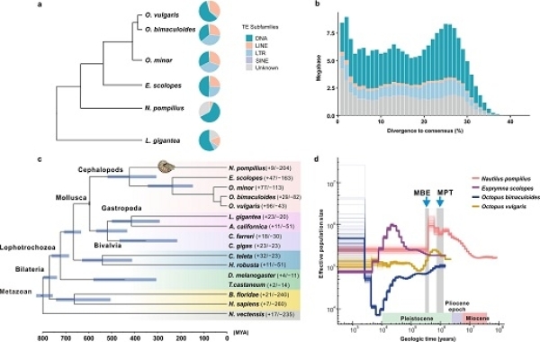 图1.鹦鹉螺基因组结构及进化关系。a、DNA转座子、LTR、LINE和SINE逆转座子在五个代表性头足类动物的基因组中的比例;b、鹦鹉螺基因组的TE分化;c、多物种进化关系;d、头足类动物历史种群评估