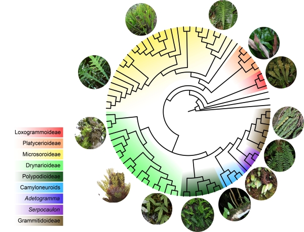 中国科学院植物研究所张宪春研究组对水龙骨科的分类和进化展开了长期研究,在国际同行的支持下,在全球范围内对水龙骨科关键类群进行取样,并通过高通量测序技术获取了代表28属78个物种的叶绿体全基因组数据,覆盖了水龙骨科全部进化分支。在谱系发生重建时,通过数据模拟消除了长枝吸引的影响,得到了迄今为止该科最稳定的系统框架,包含九个分支,分别代表剑蕨亚科(Loxogrammoideae)、鹿角蕨亚科(Platycerioideae)、星蕨亚科(Microsoroideae)、隐子蕨亚科(Crypsinoideae)、禾叶蕨亚科(Grammitidoideae)、多足蕨亚科(Polypodioideae)、带蕨亚科(Campyloneuroideae)、边鳞蕨亚科(Adetogrammoideae)及蛇茎蕨亚科(Serpocauloideae)。同时,各个分支的界定也得到如根状茎鳞片形态、叶片分裂式样、叶脉类型、孢子囊群类型、隔丝形态以及孢子形态等形态学证据的支持。