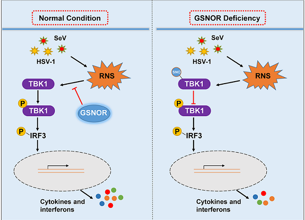 天然免疫是机体抵御病毒感染的第一道防线。宿主细胞利用模式识别受体识别病毒入侵,通过一系列信号转导激活IFN表达,进而抑制病毒感染。在细胞质中,分别由RIG-I样受体和cGAS识别RNA和DNA病毒,RIG-I样受体通过接头分子MAVS向下游传递信号,而cGAS通过STING向下游传递信号。MAVS和STING都招募TBK1,TBK1可以磷酸化IRF3,进而诱导IFN表达。机体精确调控天然免疫信号通路中的关键分子,实现自身稳态维持。常见的调控是对抗病毒蛋白翻译后修饰的调控,如磷酸化和泛素化修饰等。蛋白质巯基亚硝基化(S-nitrosation)是一种基于氧化还原的蛋白质翻译后修饰,可利用改变蛋白构象、稳定性、亚细胞定位和生物化学活性等方式,调节多种生理和病理过程。GSNOR是一种进化上高度保守的亚硝基化谷胱甘肽(GSNO)的还原酶,通过代谢GSNO进而调节蛋白质巯基亚硝基化。