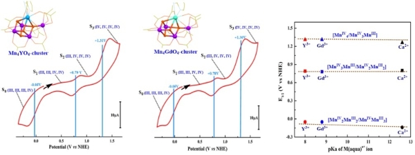 近日,研究团队攻克含稀土离子仿生OEC的合成难题,首次制备出稳定的含稀土离子Mn4YO4-簇合物和Mn4GdO4-簇合物。X-射线单晶结构解析证实这些新型仿生簇合物的核心骨架和配体环境与前期报导的Mn4CaO4-簇合物及生物OEC极为相似(图1)。例如,它们都拥有一个不对称的Mn4XO4核心(X=Ca2+/Y3+/Gd3+),簇合物外周配体均主要由羧基提供;簇合物整体均呈电中性,四个锰离子价态均为(III,IV,IV,III)。电化学性能测试证实三种仿生Mn4XO4-簇合物(X=Ca2+/Y3+/Gd3+)具有几乎相同的氧化-还原电位(图2),且电位与生物OEC类似。这些结果说明含稀土离子的仿生Mn4XO4-簇合物不仅模拟了生物OEC的几何结构和电子结构,而且模拟了生物OEC的氧化-还原特性。该工作改变了人们关于稀土离子无法在结构和性能上替代OEC中钙离子的认知(C. F. Yocum, Coord. Chem. Rev. 2008, 252:296-305),同时质疑了前人非锰金属离子(如Ca2+,Y3+,Gd3+)的Lewis酸碱性调控簇合物氧化-还原电位的观点(E. Y. Tsui, et al. Nat. Chem. 2013, 5:293-299)。获得的新型仿生簇合物为研究光合作用水裂解催化中心结构和机理提供了理想的化学模型,同时使仿生水裂解催化剂研制突破了对钙离子的依赖,为发展稳定、廉价、高效人工光合作用水裂解催化剂奠定了基础,有望为实现利用太阳能和水产生获取清洁能源(氢能)开辟新途径。相关研究成果于近日在线发表在《美国化学会志》上。