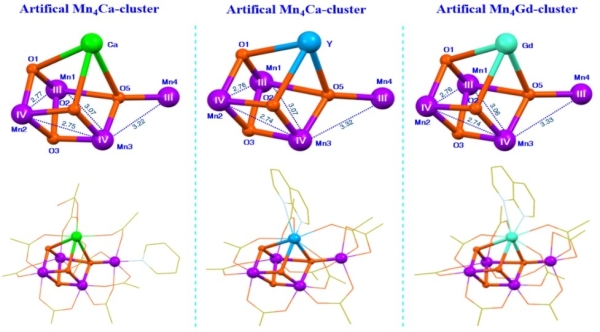 图1 三种仿生Mn4XO4-簇合物(X = Ca2+/Y3+/Gd3+)的核心和整体结构比较