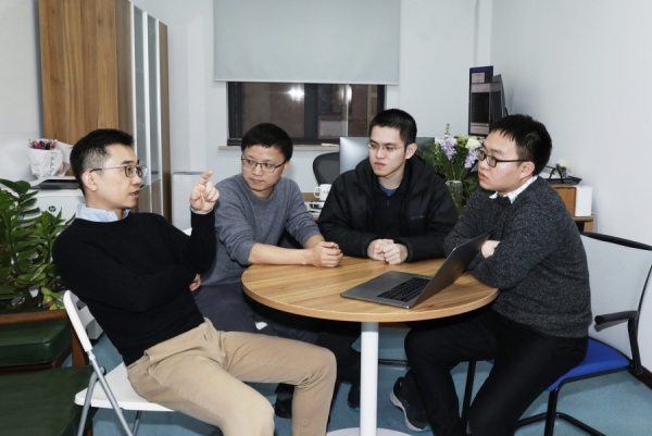 图3.研究员王立平、副研究员闵斌、研究助理胡沛烑、博士后谢洋讨论课题