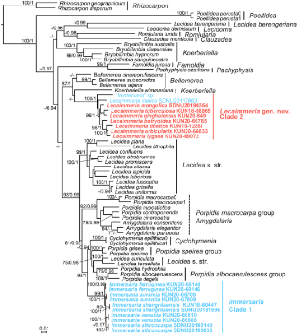 相关研究成果以Revision of Immersaria and a new lecanorine genus in Lecideaceae (lichenised Ascomycota, Lecanoromycetes)为题,发表在MycoKeys上。研究工作得到国家自然科学基金、第二次青藏高原综合科学考察研究、中科院青年创新促进会以及植物化学与西部植物资源持续利用国家重点实验室开放课题的支持。