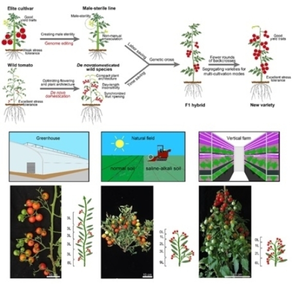研究选择经典栽培番茄品种Ailsa Craig(AC)作为亲本材料,利用CRISPR/Cas9敲除番茄小孢子时期特异表达的异胡豆苷合成酶编码基因SlLAP3,创制了雄性不育材料,并证实除育性外该材料的生长发育和产量品质等农艺性状均不受影响。为了获得优异耐逆性状,研究选择了起源于秘鲁海滨重度盐碱地的野生醋栗番茄Solanum pimpinellifolium (S. pimp)作为供体,利用多靶点基因组编辑系统同时靶向实验室早期鉴定的番茄开花和株型从头驯化基因模块——SELF-PRUNING 5G (SP5G)和SELF-PRUNING (SP)基因,快速创制了对光周期不敏感,且兼具果实同步成熟和紧凑株型的从头驯化株系,克服了野生番茄生长习性的差异,并保持了其耐受重度盐碱和高抗病的优异性状。将从头驯化的S. pimp株系与AC雄性不育系杂交,F1代植株与亲本相比呈现中间表型。在F2分离群体中获得了兼具母本产量和品质性状、父本耐重度盐碱和高抗病性状的植株。同时,F2分离群体还可以分离获得除了兼具上述性状以外分别含有sp, sp5g, sp sp5g三种突变组合的株系,它们呈现不同株型,可分别适宜露地栽培、温室栽培和植物工厂栽培等多种种植模式。该研究通过整合从头驯化和雄性不育系快速创制,实现了优异野生种和栽培种资源挖掘利用和种质创新中的人力和时间成本的“双减”,而驯化基因模块的多样化分离实现了种植方式的“多增”。