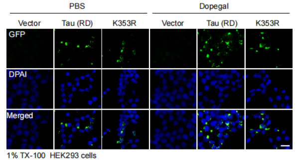 图1.DOPAGEL促进细胞内Tau的聚集而K353R突变可以阻断DOPEGAL的促进作用