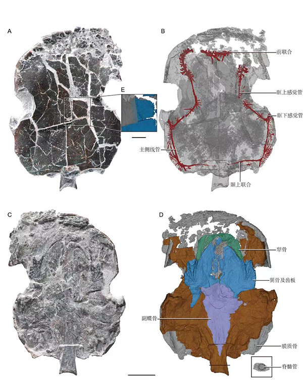 图2.A、会泽滇双翼鱼正型标本(背视),B、会泽滇双翼鱼感觉管系统三维虚拟模型(背视),C、会泽滇双翼鱼正型标本(腹视),D、会泽滇双翼鱼膜质骨/犁骨/翼骨与副蝶骨三维模型虚拟(腹视)。A-E比例尺为10mm,E比例尺为5mm。(罗彦超供图)