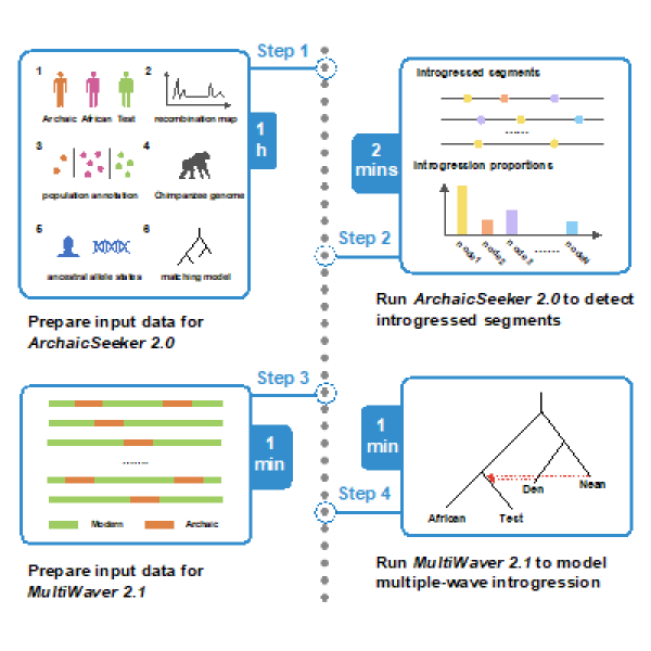 现代人类与古人类在漫长的演化历史中存在着错综复杂的基因交流关系。由于现代人群中目前所保留的基因渗入比例较低且渗入时间较为久远等因素,以往用于检测古人类对现代人类基因渗入片段的方法大都未取得良好效果,此外,精细化重构现代人类与古人类之间的基因交流历史模型也存在较大难度。ArchaicSeeker 2.0可针对性地解决此类问题,有效检测和量化近缘种的基因交流,并在更精细的尺度上重构复杂的基因交流历史。该方法主要由三个功能模块组成:搜寻潜在的基因渗入片段、将渗入片段匹配至对应的祖先人群和构建遗传渐渗历史模型。此前关于ArchaicSeeker 2.0方法的介绍参见http://www.sinh.cas.cn/xwgg/kyjz/202111/t20211102_6240465.html。