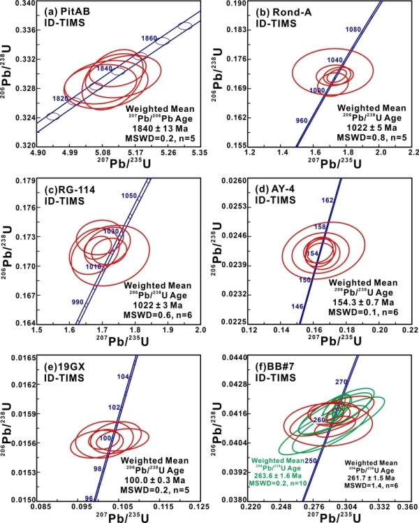 图1.ID-TIMS测定(a)PitAB(巴西)、(b)Rond-A(巴西)、(c)RG-114(刚果金)、(d)AY-4(湖南)、(e)19GX(广西)、(f)BB#7(美国)锡石样品U-Pb谐和图