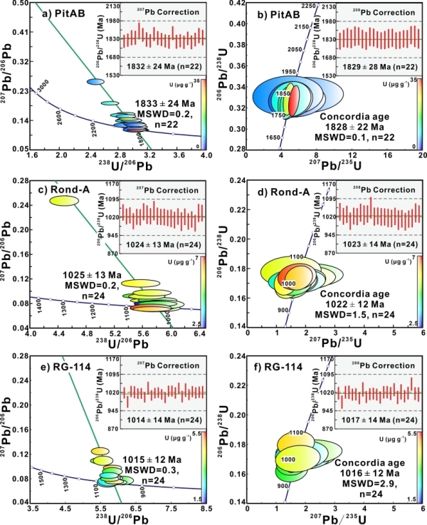 图2.LA-SF-ICP-MS方法测定PitAB(巴西)、 Rond-A(巴西)、RG-114(刚果金)锡石样品的T-W图解与207Pb校正的206Pb/238U加权平均年龄(a、c、e),以及208Pb校正的谐和年龄和206Pb/238U加权平均年龄(b、d、f)