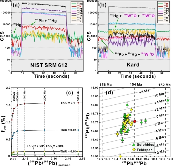 图3.LA-SF-ICP-MS方法分析NIST 612玻璃标准物质(a)与锡石Kard(b)的各质量数信号强度随时间的变化及钨氧离子团的干扰;(c)不同Th/U比值对208Pb普通铅校正方法的影响;(d)普通铅扣除对低238U/204Pb矿物相年龄结果的影响(以AY-4为例)