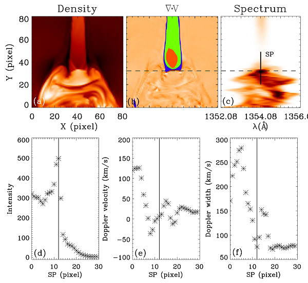另一方面,基于数值模拟的极紫外(EUV)合成图像,研究人员认为这个分界面可能跟终止激波有关,其高度也与硬X射线源的高度一致。因此,观测谱线的变化特征可能是在EUV波段里找出终止激波结构的一个有效工具。