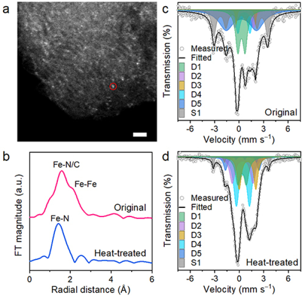 研究中,王军虎团队利用57Fe穆斯堡尔谱技术揭示了Fe单原子催化剂的配位环境(主要为Fe4N结构),明确探测到少量难以被其它方法确定的Fe原子簇,并确定为碳化三铁(Fe3C,S1)。研究发现,经过热处理提纯后,即使样品中的Fe3C团簇仅有4%,也可被轻易检测到。该实验表明,57Fe穆斯堡尔谱技术是精确表征Fe单原子催化剂纯度可靠且不可或缺的技术。