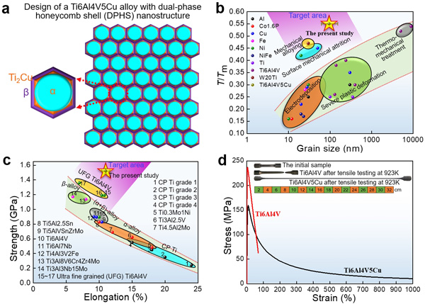 图1.双相蜂窝壳结构纳米晶Ti6Al4V5Cu合金的组织设计与性能:a、组织设计示意图;b、失稳温度-晶粒尺寸图,显示材料具有良好的组织热稳定性;c、室温强度-延伸率图,相较于其它钛合金,材料具有良好的强塑性匹配;d、650℃/0.01s-1条件下的拉伸应力-应变曲线,材料的延伸率超过1000%