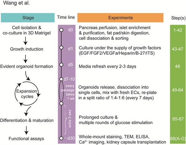 曾艺研究组长期致力于成体干细胞的研究,包括鉴定干细胞身份属性、确定干细胞信号调控机制、研究干细胞与疾病的关系以及建立基于干细胞的体外类器官培养体系等。前期研究发现并鉴定了小鼠胰岛成体干细胞,并建立了小鼠胰岛类器官体外长期扩增的培养体系。此次研究工作详细分解了小鼠胰岛类器官培养的技术方法。首先,研究描述了如何从小鼠中分离Procr胰岛干细胞,接着通过干细胞与血管内皮细胞的共培养方法,建立了体外高效形成可长期扩增的胰岛类器官体系,可使这类胰岛类器官达到成熟状态,最后提供了体外、体内评估胰岛类器官成熟程度和功能有效性的多个下游试验方法。该研究为体外长期培养并获得大量功能性小鼠胰岛β细胞贡献了详细的技术方法,也为体外获得大量人胰岛β细胞提供了重要提示。