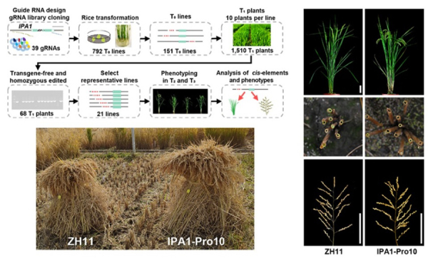 为突破IPA1多效性造成的穗部和分蘖的制约关系,最新研究提出通过改造IPA1的顺式调控区,分别调控其在幼穗、茎基部等各组织中的表达水平,实现不同表型的特异性调控,从而打破产量因素之间负效应的策略。而由于之前技术方法的制约,缺乏关于作物顺式调控区功能的研究,对IPA1顺式调控区的功能研究也知之甚少。该团队使用平铺删除(tiling deletion)的方法,通过多靶点CRISPR/Cas9对IPA1的顺式调控区进行系统性高覆盖度的片段删除,创制出大量IPA1顺式调控区平铺删除的基因编辑材料,并从中发掘出一个可以同时提高分蘖数和穗粒数的编辑材料IPA1-Pro10及其对应的54bp关键顺式作用元件。IPA1-Pro10具有穗重和穗数同时增加、株高变高、茎秆和根系粗壮的表型。经田间小区测产鉴定,IPA1-Pro10与对照品种中花11相比能够增产15.9%,提高了水稻产量。该研究进一步阐明IPA1顺式调控区调控穗部表型的分子机制,发现驯化关键转录因子An-1能通过结合54bp关键顺式作用元件中的一个GCGCGTGT基序特异调控IPA1在幼穗的表达水平,进而特异调控穗部表型。该研究通过平铺删除策略,通过编辑筛选水稻关键基因的顺式调控区实现了水稻产量关键要素间负相关性的解除,为通过创制全新遗传资源打破水稻产量瓶颈提供了有效策略。