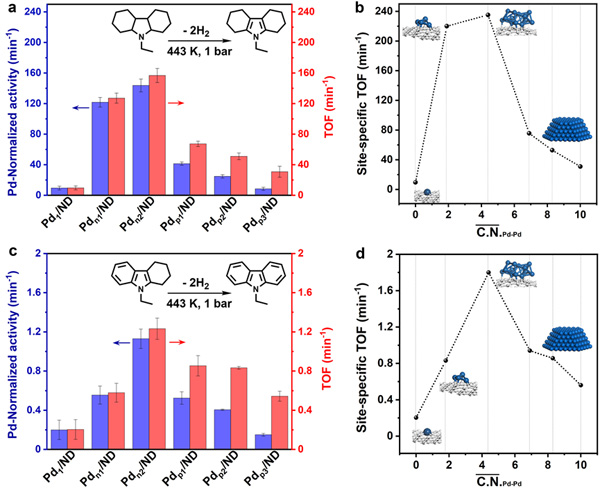 基于上述研究工作,研究团队发现在十二氢咔唑脱氢制氢反应中,亚纳米尺度全暴露Pdn团簇催化材料亦表现出优异的脱氢制氢性能。此外,基于不同Pd物种对CO吸附模式的差异性,研究通过红外光谱对不同催化剂表面Pd的分散状态进行了定量描绘,估计出不同结构Pd物种在催化剂中的比例,并结合X射线吸收谱分析结果,建立不同尺度Pd物种的平均配位数与本征活性TOF之间的构效关系,结果表明高活性亚纳米尺度Pdn 金属团簇具有有利于活化反应物分子的金属集团位点以及抑制产物强吸附行为的特点(图2)。上述发现为设计新一代亚纳米尺度高效制氢金属催化材料提供了科学依据和理论指导。
