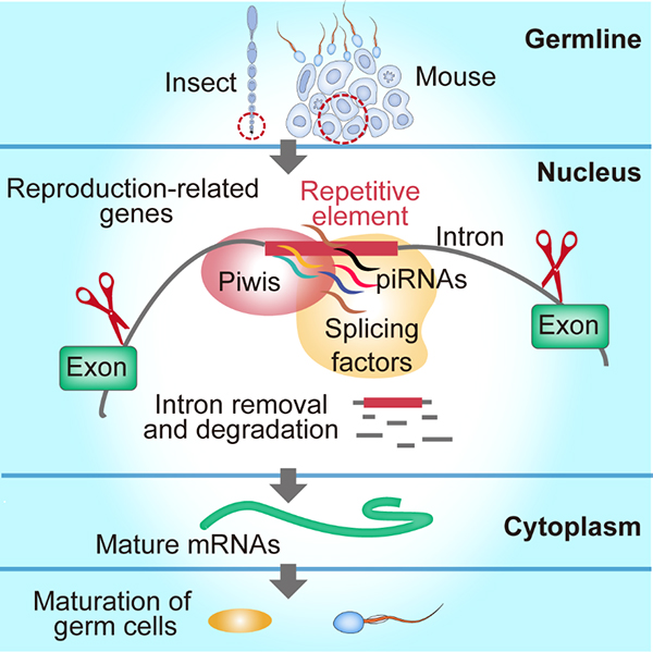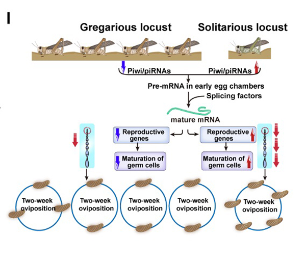 该研究是继康乐团队发现piRNAs是群居型、散居型飞蝗中表达差异最大的一类小RNA(Wei et al, Genome Biology, 2009)后,进一步证明了piRNAs对飞蝗生殖策略可塑性的调控机制,并揭示了Piwi/piRNAs介导的前体mRNA剪切对生殖功能相关基因的加工调控作用。该团队近期的另一研究还发现,脑中的piRNAs通过调控神经肽NPF1的表达来控制飞蝗的取食量(Wang et al., EMBO Reports, 2022)。飞蝗piRNAs研究在生殖细胞和体细胞中同时取得的重要进展,既为开发蝗灾控制方法提供新思路,又将飞蝗发展成为研究非编码RNA的重要模式昆虫。4月26日,相关研究成果以piRNA-guided intron removal from pre-mRNAs regulates density-dependent reproductive strategy为题,在线发表在Cell Reports上。复旦大学科研人员参与研究。
