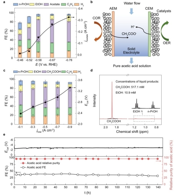 精确控制C1分子实现C-C偶联合成特定C2化合物是当前电催化合成的难点。研究人员发现电催化C1分子合成乙酸特异性地受催化剂表面几何结构影响,并通过理论模拟发现晶界结构能有效提高C1分子转化效率。研究人员利用Ni-N-C单原子催化二氧化碳形成一氧化碳中间体,其法拉第效率近100%。然后,研究人员将收集的一氧化碳经脉冲电化学还原工艺形成的晶界铜催化合成乙酸。在气体扩散流动池中,乙酸盐法拉第效率最高可达52%;最高偏电流密度可达321毫安每平方厘米,此时乙酸盐法拉第效率仍保持在46%。为降低液体产物与电解质溶液及相关副产物分离成本和方便产物乙酸的下游利用,研究人员进一步开发了多孔固态电解质反应器,使阴极得到的乙酸根与阳极得到的氢离子结合形成高纯乙酸水溶液,无须分离提纯可直接用于下游生物发酵。通过新型电解装置测试,催化剂可在250毫安每平方厘米偏电流密度条件连续140小时制得纯度为97%的乙酸水溶液,从而解决了电合成过程中“浓度”与“纯度”两个关键难点(图2)。