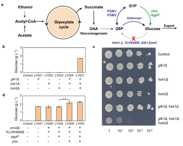 随后,研究人员将电合成得到的高纯乙酸溶液投喂给酿酒酵母,以期通过酵母的代谢工程进一步合成出葡萄糖等食品分子。为此,研究人员对酿酒酵母进行了基因编辑。酿酒酵母中,乙酰辅酶进入乙醛酸循环合成草酰乙酸经糖异生途径形成葡萄糖-6-磷酸。研究人员将酿酒酵母中三个己糖激酶(Glk1、Hxk1、Hxk2)敲除,废除酿酒酵母菌株利用葡萄糖能力,同时获得葡萄糖“泄露”表型。敲除三个己糖激酶后,工程菌株在摇瓶发酵条件下,葡萄糖产量为1.7 g/L(图3)。继续敲除两个假定己糖激酶(YLLR446W, EMI2),同时过表达来自泛菌属的葡萄糖磷酸酶基因agpP和大肠杆菌的HAD4(haloacid dehalogenase-like phosphatase 4)基因yhix,葡糖糖产量达2.2 g/L,产量提高30%。
