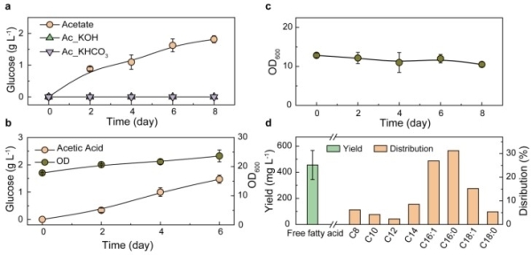 研究人员分别以电催化合成乙酸及乙酸盐为唯一碳源,分批补料添加方式,利用产糖酿酒酵母合成葡萄糖,乙酸盐和乙酸为碳源分别合成葡萄糖1.8 g/L、1.5 g/L(图4)。游离脂肪酸是一类C8-C18组成的长链多碳化合物总称,因其在生产油脂化学品和生物燃料生产方面的潜在用途而受到关注。目前有关游离脂肪酸生产研究主要以葡萄糖为底物,研究人员以电催化合成乙酸为底物,在构建的产脂肪酸菌株中合成脂肪酸,合成脂肪酸含量检测可达448.5 mg/L, 不同碳链长度脂肪酸含量如图4所示。