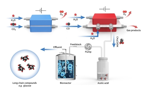4月28日,电子科技大学材料与能源学院夏川课题组与中国科学院深圳先进技术研究院合成生物学研究所于涛课题组、中国科学技术大学曾杰课题组合作,在Nature Catalysis上发表了题为Upcycling CO2 into energy-rich long-chain products via electrochemical and metabolic engineering的研究论文。该工作首先通过电催化将二氧化碳和水合成高纯乙酸,再以乙酸及乙酸盐为碳源经生物发酵合成葡萄糖和脂肪酸等长碳链分子。