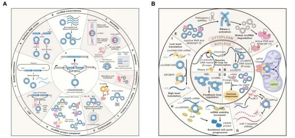 环形RNA的发现、鉴定和功能解析手段;图B:环形RNA参与调控细胞内多种生物学过程的分子模型;图C:可翻译的环形RNA及其调控模型;图D:环形RNA在生物医学领域的转化应用场景