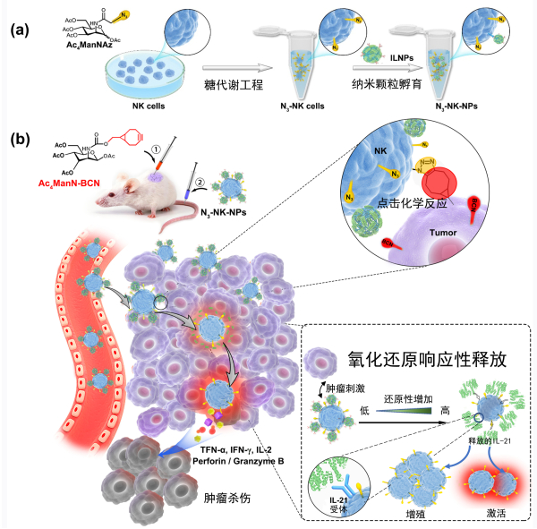 以自然杀伤细胞(NK)为基础的免疫疗法在癌症治疗中颇具潜力,而其受到在实体肿瘤中的应用功能迅速下降以及归巢和浸润不足的限制。科研团队基于前期研究(Small, 2019, 15, 1804383;Advanced Science, 2019, 1900251;Bioactive Materials, 2021, 6, 951-962)提出了一种生物正交靶向的活细胞纳米载体技术。研究利用在NK细胞表面植入生物正交基团及偶联白介素-21(IL-21)纳米颗粒(ILNPs)实现其对实体瘤的深度浸润及原位激活。