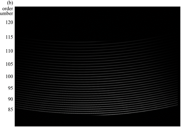 图1 2.16米天文望远镜高分辨率光纤光谱仪(HRS)二维光谱实测图。纵轴标示的数字是HRS的衍射级次。(a)钍氩灯,(b)FPE