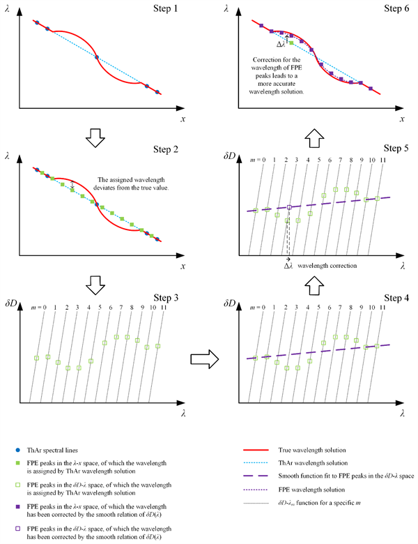 法布里-珀罗标准具(FPE)在进行精细的稳定性控制后可用于高精度波长定标,是备受关注的新型定标源。它的光谱呈现出密集、排列规则的透过峰序列,具有宽广的波长覆盖范围,有望实现优于10 cm/s的定标精度。由于FPE透过峰波长未知,这使单独利用FPE无法定出光谱仪波长的空间分布关系(即波长解),阻碍了FPE定标的实际应用。