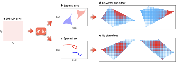 图1.普适趋肤效应的定理。若谱面积非零,则哈密顿量在一些一般的开边界几何上表现出趋肤效应;反之,哈密顿量在任何开边界几何上都不会出现趋肤效应。