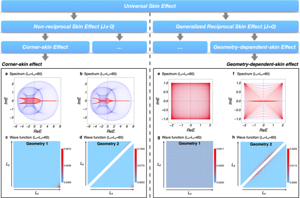 图2.角趋肤效应和几何依赖趋肤效应。普适趋肤效应可以根据电流泛函被分为两类,即非互易趋肤效应和广义互易趋肤效应。其中角趋肤效应和几何依赖趋肤效应分别作为这两类的代表性现象。