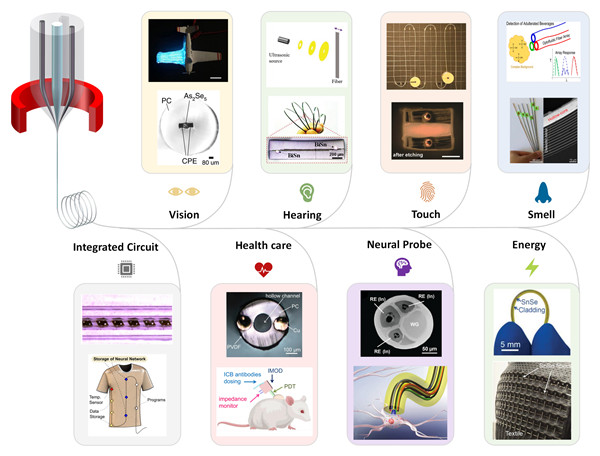 应用于信息科技的热拉制功能纤维。包括五感(“视”,“听”,“嗅”,“味”,“触”)纤维、芯片集成纤维、生化探针纤维、神经探针纤维和能源收集/储存纤维