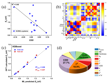 图2.(a)Ea与CDD的线性关系;(b)所选描述符间的Pearson相关系数矩阵的热图;(c)DFT计算的Ea与基于XGBoost模型ML预测的Ea的相关性;(d)XGBoost模型结果的特征重要性分析