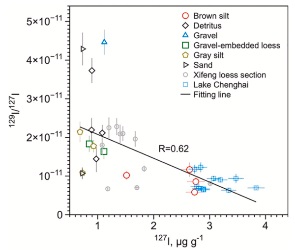地球环境研究所副研究员范煜坤等开展了青藏高原雪水河阶地(全新世以来)以及程海湖(近200年以来)等沉积物中的碘同位素分析工作,旨在进一步认知内陆环境碘同位素的地球化学行为特征。该工作首次获得了河湖等沉积物中的天然129I/127I比值,发现了具有比黄土沉积更宽的分布范围(0.58-1.23)×10-11(图1、2);揭示了129I/127I比值与碘含量存在大致的反相关关系(图3)。研究结合沉积物岩性以及物源地层形成年龄分析表明,该变化规律可能指示了人工碘和环境中“老碘”的混合效应,(0.94-1.23)×10-11或是河湖沉积物中达到稳态的天然129I/127I比值。该数值在陆相沉积中是否具有时空普遍性以及该范围的精确度仍需进一步工作验证和限定。