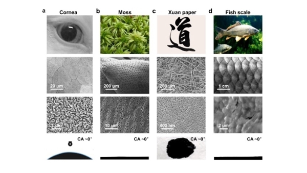 文章介绍了经过亿万年进化后自然界中选择留下的各种优异超铺展表面,包括动物角膜、宣纸等。自然界中超铺展表面的优异性能直接决定了其正常作用的发挥甚至其生理功能。这些自然表面均使用了微纳复合的多尺度结构来实现超铺展性能;从分子尺度的表面自组装水分子结构引起的新的亲疏水界线(65°)到纳米结构和微观结构在超铺展过程中的宏观各自作用,综述了超铺展本质机理研究的最新进展;进一步总结了常用的超铺展表面制备方法、介绍了超铺展表面的应用领域,提出了超铺展体系,总结了该领域存在的挑战。