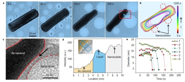 孙立涛团队利用电子束辐解水产生氧气气泡,首次构建并实时观察了溴化氢水溶液中氧气气泡刻蚀金纳米棒的固-液-气三相反应(图1)。实验观测观察发现,当金纳米棒周围没有纳米气泡时,该纳米棒逐渐被氧化刻蚀演变成表面光滑的椭球形并最终消失;而当金纳米棒周围存在纳米气泡时,靠近纳米气泡的位置的纳米棒被加速刻蚀,并演变成局部凹陷的结构。当发生局部凹陷时,纳米棒和纳米气泡并非是直接接触的,二者之间存在超薄液膜(图2)。大量实验结果定量分析可知,仅当纳米气泡与固体之间的距离小于临界尺寸(~1 nm)时,刻蚀速率才显著提升(一个量级以上);否则,刻蚀速率几乎不变。