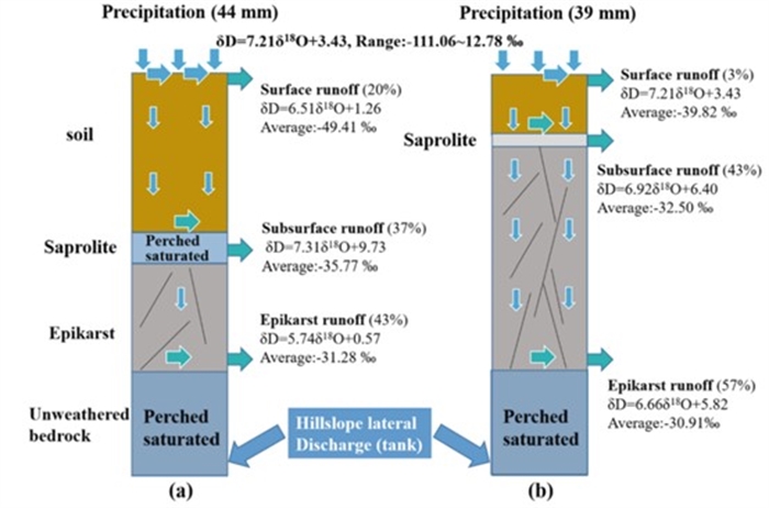 图2.深厚土层(a)和浅薄土层(b)坡地降雨—径流关系概念模型