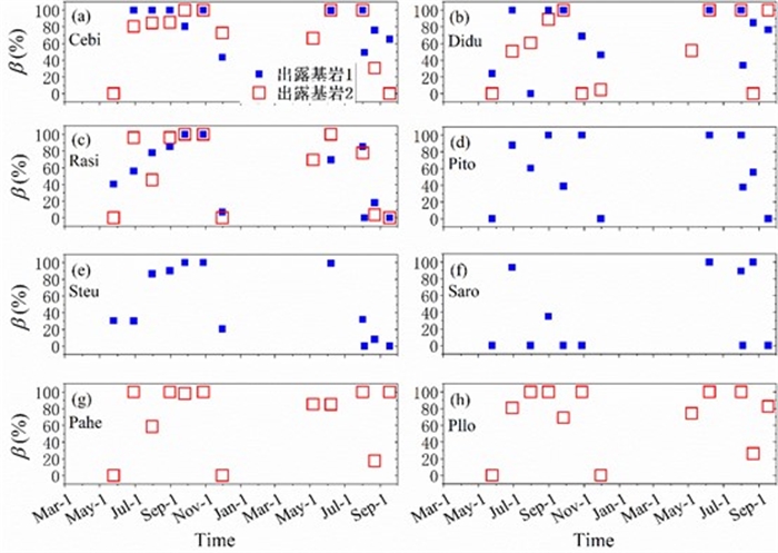 图3.出露基岩生境8种植物根区水分补给比例(β)季节动态