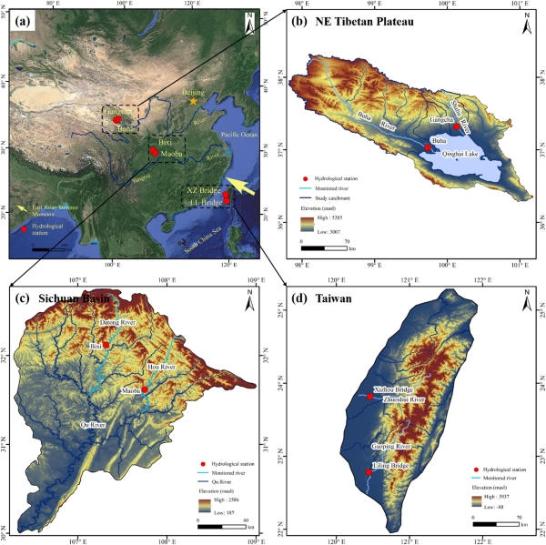 针对上述问题,地球环境所研究人员沿东南季风沿线选取了三个具有显著气候梯度的区域来探究全球变暖背景下地表侵蚀的季节性行为及其控制机制。三个典型区域从北至南分别为:高寒青藏高原的青海湖流域、较为温暖的四川盆地及温暖湿润的中国台湾地区,每个区域均选取2个代表性小流域开展为期1-2年的野外监测研究以保证结果的可靠性(图1)。