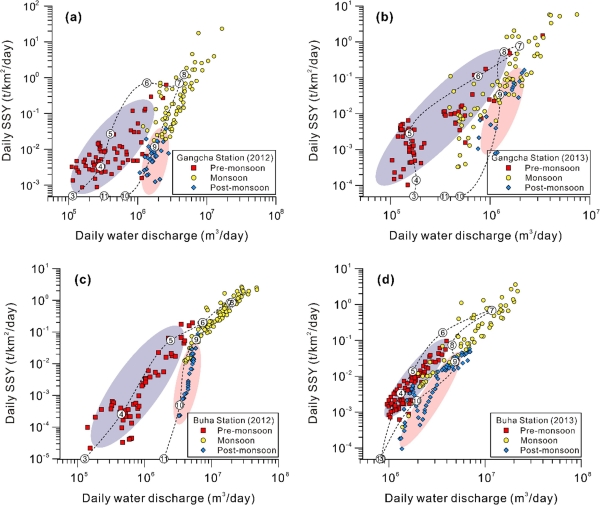 研究结果表明,青藏高原流域的冻融作用破碎了土壤颗粒,导致大量松散物质在雨季前低流量情况下被快速输出,产生了雨季前期河流泥沙就开始快速增加的现象(图2)。全球其他冰川及冻土区也发现了此现象,而没有冻融作用的四川和台湾河流则未观测到该现象(图3)。上述结果间接地分离出高寒区冻融作用对地表侵蚀的影响,补充了现有理论对季节性侵蚀行为及其控制机制研究的不足。