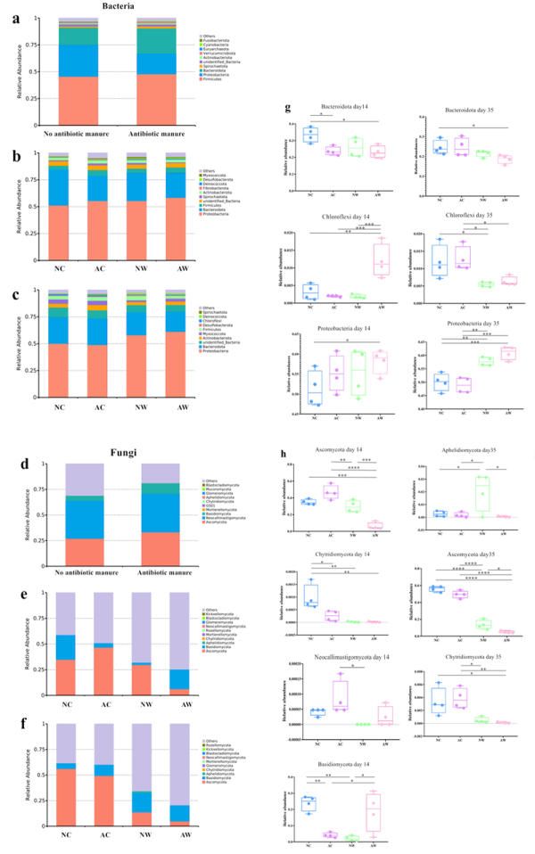 研究发现,在四种发酵基质(无抗牛粪+玉米秸秆、无抗牛粪+小麦秸秆、有抗牛粪+玉米秸秆、有抗牛粪+小麦秸秆)上栽培双孢蘑菇,可以蘑菇氮的形式回收秸秆和粪便中总氮的3.33-5.88%。残留的莫能菌素抑制了基质中氨化与反硝化菌的活性,从而降低了基质发酵过程中的氮损失,提高了氮转化效率(表1)。而发酵和栽培过程中,基质中与氮转化相关的酶活性(表2)以及微生物群落结构和演替变化(如图)引起的氮损失变化,莫能菌素最终降低了整个循环系统中氮回收率的0.13%-1.57%。该研究为构建高效的种养一体化循环农业技术模式提供了数据支撑。