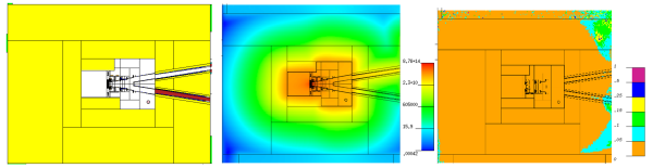 图2.IFMIF-DONES T栅元水平剖视图(左)、中子通量分布(中)、误差分布(右)