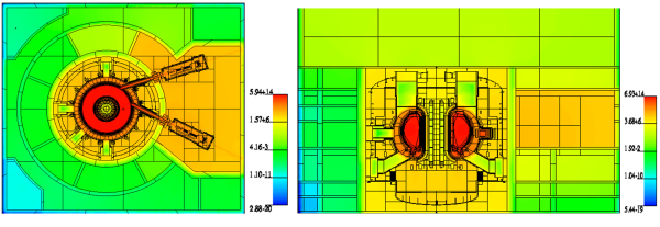 图3.CFETR 360°模型横向切面(左)、纵向切面(右)中子通量分布图