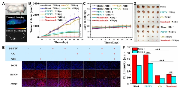 进一步细胞实验表明,当将该纳米聚集体分别与肿瘤细胞与正常细胞共孵育后进行低温光热治疗,仅在肿瘤细胞存在的情况下释放CO气体,而在正常细胞存在的情况下并不释放。肿瘤细胞的增殖得到有效抑制。免疫印迹分析结果表明,当纳米聚集体存在时,低温光热处理的肿瘤细胞中的热休克蛋白表达水平得到极大抑制。研究结果表明,肿瘤细胞中过量表达的双氧水促进了纳米聚集体中CO气体的释放,从而抑制了热休克蛋白的合成,降低肿瘤细胞的耐热性,从而提升了肿瘤低温光热治疗的效果。而正常细胞由于热休克蛋白表达过程不受影响,因此避免了光热治疗对其造成的损伤。为进一步证实该策略的临床转化潜力,研究人员开展了初步小动物实验,结果表明,注射了PBPTV@mPEG(CO)纳米聚集体的小鼠在低温光热治疗下,肿瘤生长得到极大抑制。免疫荧光成像结果表明,肿瘤部位的热休克蛋白表达受到极大抑制。治疗过程中小鼠体重没有明显变化,血液生化指标显示正常,说明了该纳米聚集体在提高肿瘤低温光热治疗的转化潜力。