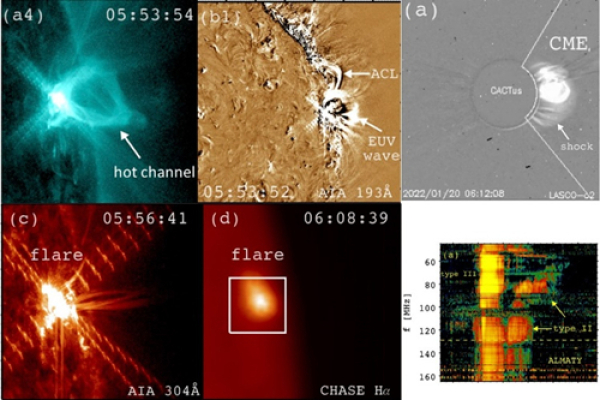 研究人员分析了发生在2022年1月20日的一次靠近太阳西边缘的爆发活动(图1),磁绳由于某种原因变得不稳定而向外爆发。它在上升期间经历了两个阶段,缓慢上升和快速上升(速度超过800 km/s)。磁绳爆发在下方色球层触发了M5.5级耀斑。耀斑在硬X射线和射电波段的光变曲线同时呈现准周期振荡(周期为18-113秒)。磁绳向外传播形成快速日冕物质抛射(CME),并驱动快模激波(对应射电II型暴),表明大尺度EUV波(传播速度为740-860 km/s)本质上就是激波。