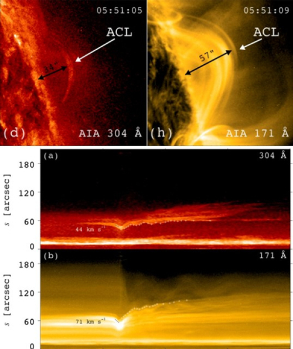 图2 SDO/AIA 304埃和171 埃两个波段观测到的ACL和对应的时距图